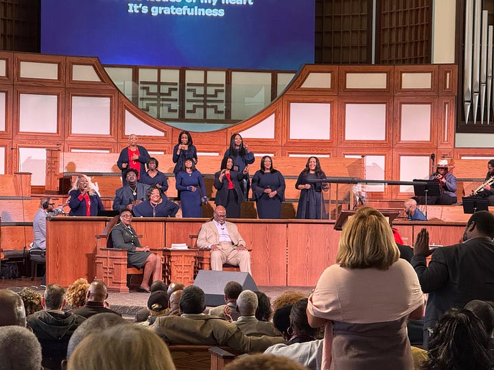 We concluded our time in Atlanta and on the tour with Sunday worship at Ebenezer Baptist Church, “America’s Freedom Church.” While senior pastor and Senator Rev. Dr. Raphael Warnock was “stuck in Washington” trying to secure food and medical benefits for millions, the message was delivered by executive pastor Rev. Dr. John Vaughn. Lively music, baby dedications (including the traditional lifting of the child to “behold the only thing greater than yourself”) an inspiring message, and a shout out to visiting groups including us filled the service.